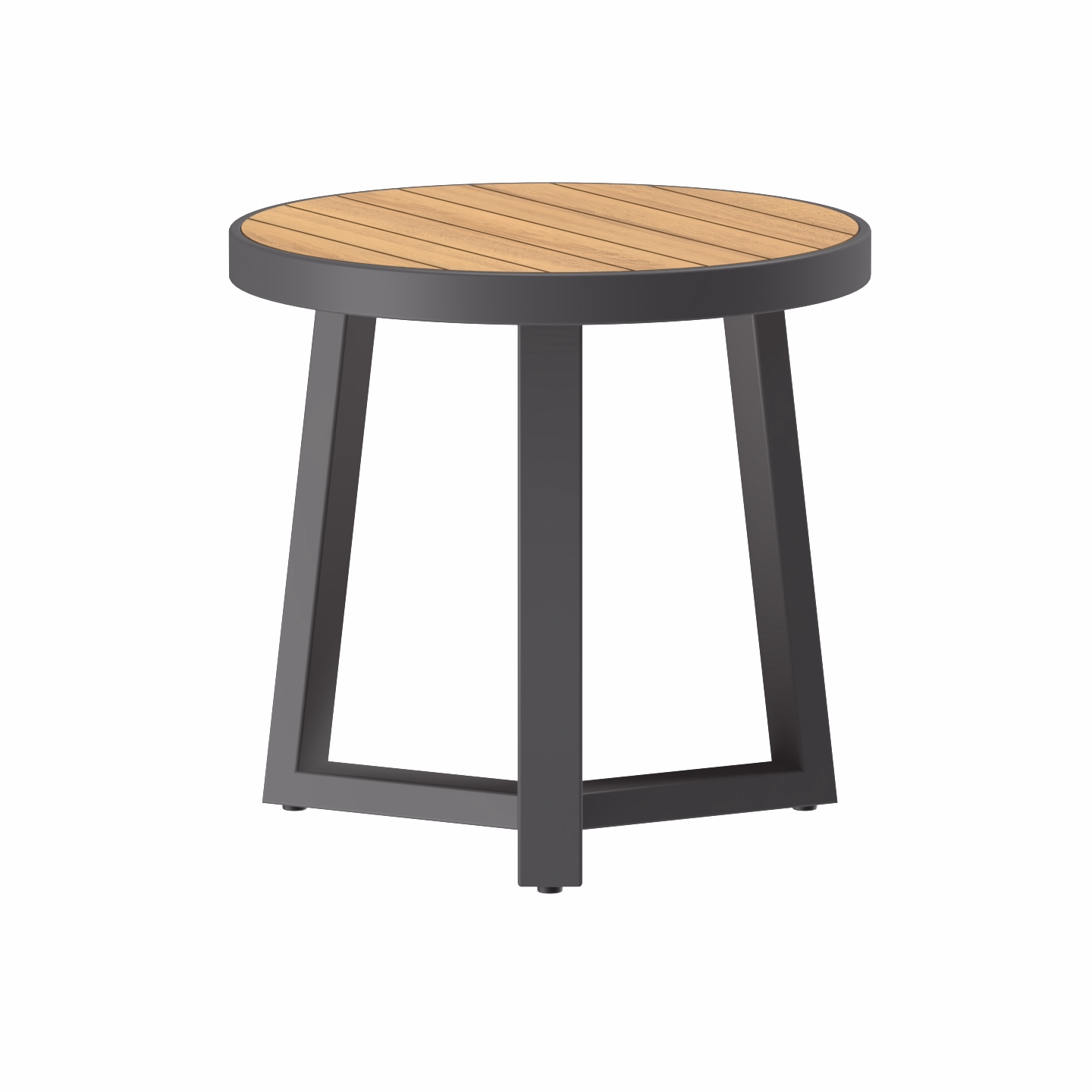 - Round slatted wooden tabletop with natural grain detail