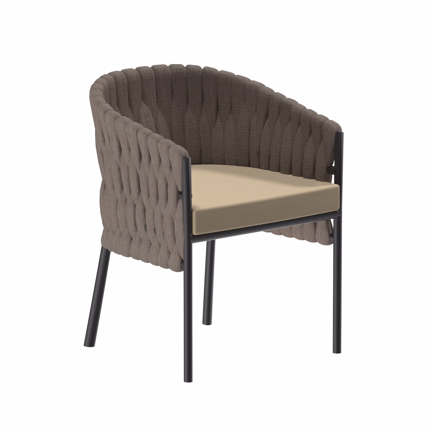 Terra offers a variety of outdoor chairs, with or without armrests, and dining armchairs characterized by a tubular aluminum structure that matches the weaving of polyester belts of the backrest.